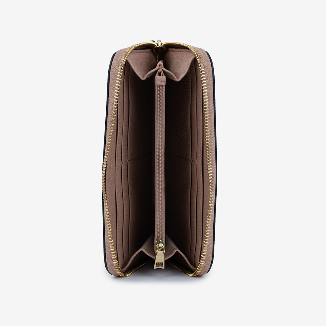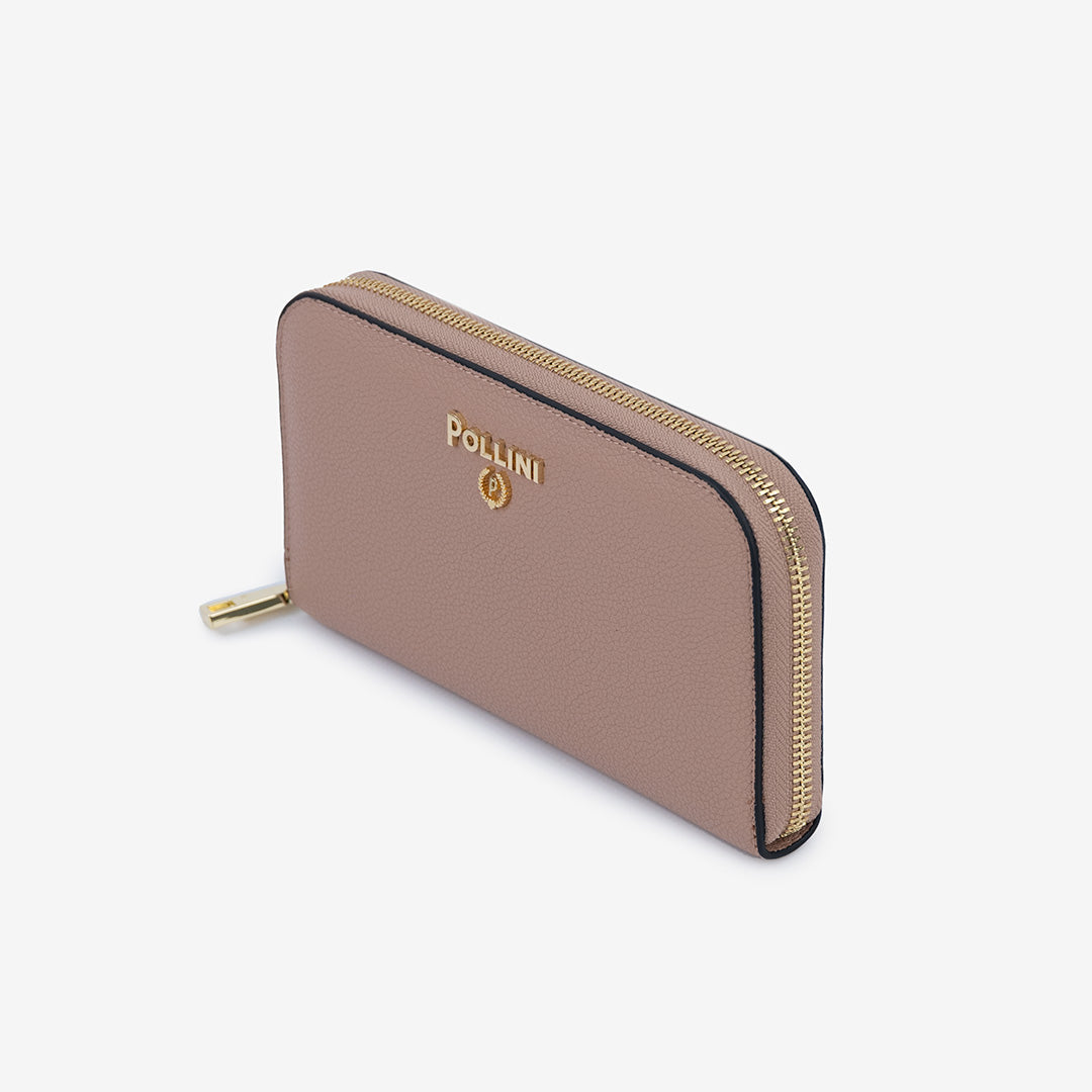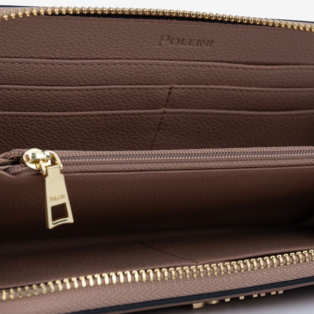 Dotato di scomparti porta carte, porta banconote e porta monete.